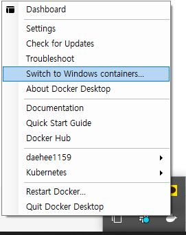 트레이 아이콘에서 Switch to Windows Container 클릭