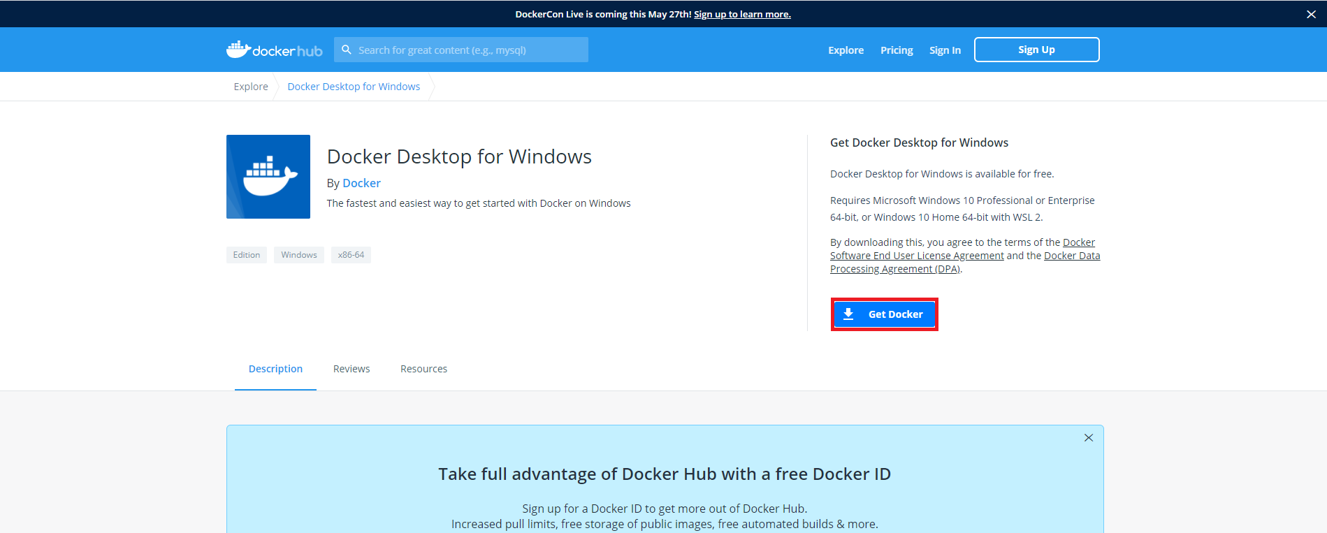 아래 링크로 접속하여 Get Docker를 통해 도커를 다운로드합니다.