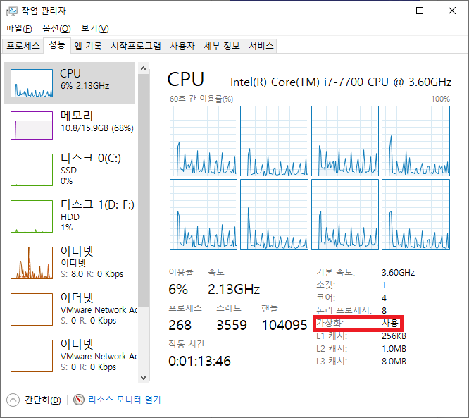 작업 관리자에서 가상화가 "사용"으로 되어 있는지 확인합니다.