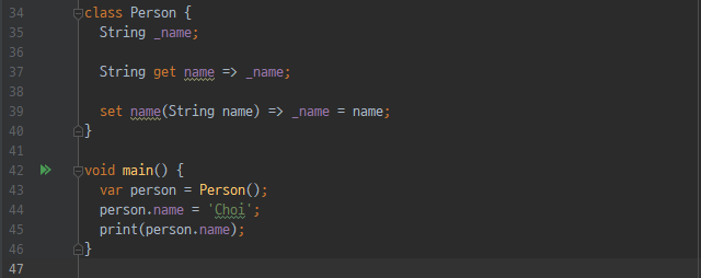 private 멤버 변수인 _name에는 직접 접근이 불가능하지만 public인 getter를 통해 접근이 가능하다. 이때 get name에서 name이 접근할 때 사용할 이름이다. set도 get과 마찬가지로 public이라 _name에 값을 할당하기 위해 접근이 가능하며 set name에서 name은 접근할 때 사용할 이름이다. 여기서 name은 setName, getName 등으로 바꿔서 사용해도 무방하다.