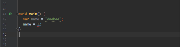 또한 Dart에서는 변수 선언 시 var를 사용하여 변수를 선언하면 타입을 추론하게 된다. var로 변수를 선언하면 참조를 저장하기 때문에 var로 선언된 변수의 타입과 다른 타입을 넣게 되면 오류가 발생한다.