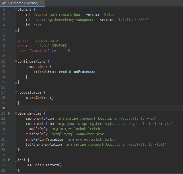 초기 build.gradle 파일입니다. 아까 추가했던 dependency들을 확인할 수 있습니다.