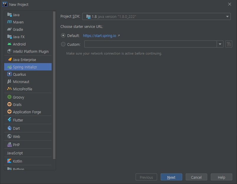 Spring Initializr를 선택합니다. 저는 자바 SDK 1.8을 사용하고 있기 때문에 1.8을 기준으로 하겠습니다. 이후 Next