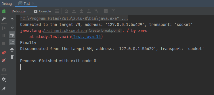 catch 블록에는 Exception이 발생하면 실행되는 코드가 들어갑니다. 즉 예외처리를 하는 코드입니다.