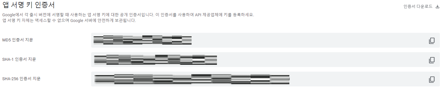 위 3번까지의 과정이 끝났다면 Google Play Console 프로덕션 / 새 버전 만들기를 통해 aab 파일을 업로드하면 업로드가 완료됩니다. 이후 설정/ 앱 서명에서 1번에서 발행한 upload key를 업로드해주면 아래와 같이 인증서 지문이 보이게 됩니다.